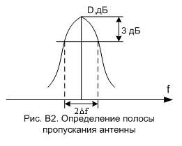 Все без исключения антенны эффективно работают в определенной полосе частот. Рабочий диапазон частот (2) для конкретной антенны может определяться по зависимости наиболее значимого для данного случая параметра от частоты: входного сопротивления, КНД, диаграммы направленности. На рис. В2 приведен пример определения полосы пропускания антенны, когда в качестве переменного параметра используется КНД (D):