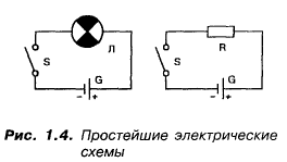 “А”: Да, но для этого совершенно необязательно заканчивать художественный институт! Весь мир уже много десятилетий как изображает электротехнические цепи любой сложности с помощью условных обозначений! Вот я зарисовал несколько простейших цепей. Смотри (рис. 1.4)!