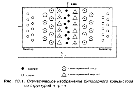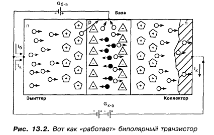 “Аматор”: При этом одна из внешних областей называется ЭМИТТЕРОМ. В таком случае вторая внешняя область именуется — КОЛЛЕКТОР. А прослойка, лежащая между ними, соответственно — БАЗОЙ (рис. 13.1).
