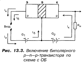 “С”: Совершенно верно! Значит, со спокойной душой переходим к основным схемам включения. Первая из них — схема с ОБЩЕЙ БАЗОЙ или ОБ. Вот как это выглядит в первом приближении (рис. 13.3).