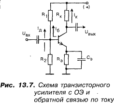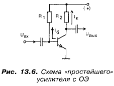 “С”: Еще бы! Возьмем для примера наиболее почитаемую электронщиками схему с общим эмиттером — ОЭ (рис. 13.6).