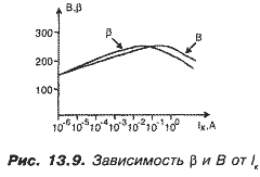 “С”: Да как не быть? Вот типовая зависимость коэффициентов статического и динамического усиления по току от величины коллекторного тока для маломощного транзистора (см. рис. 13.9).