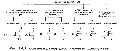 Вообще к настоящему времени известно около двух десятков различных видов полевых приборов. Основная масса их выполняется на основе кремния или арсенида галлия. Германиевые полевые приборы не применяются в силу ряда причин. Но для наших практических целей достаточно иметь представление о СЕМИ разновидностях полевых транзисторов (рис. 14.1).