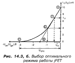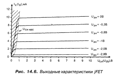 “С”: Да нет, я бы не сказал! А, впрочем, судите сами: Здесь представлено семейство выходных характеристик JFET, передаточную характеристику которого мы рассматривали раньше (рис. 14.6).