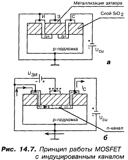 “С”: Безусловно! Более того, даже подавая на затвор незначительное положительное (относительно истока) напряжение, мы эт> ситуацию изменить не в состоянии! MOSFET — заперт! Но, как известно, электроникой занимаются очень настойчивые люди! Мы продолжаем повышать потенциал (см. рис 14.7б). Не торопясь, плавно... И в какой-то момент... появляется ток стока! Это означает, что некоторый положительный потенциал затвора через диэлектрик SiO2 навел (или индуцировал) канал проводимости n-типа, по которому электроны “двинулись” от истока к стоку!