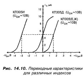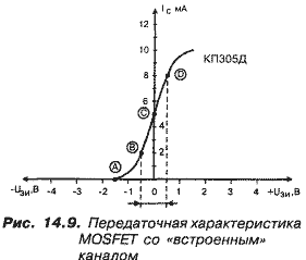 “С”: И совершенно напрасно, поскольку именно они в значительной степени “делают погоду” в схемотехнике радиоприемников! Добавим, чго их возможности шире, чем у транзисторов с индуцированным каналом. Да вот, посмотрите на рис. 14.9. Здесь представлена передаточная характеристика МОП-транзистора со встроенным n-каналом типа КП305Д,