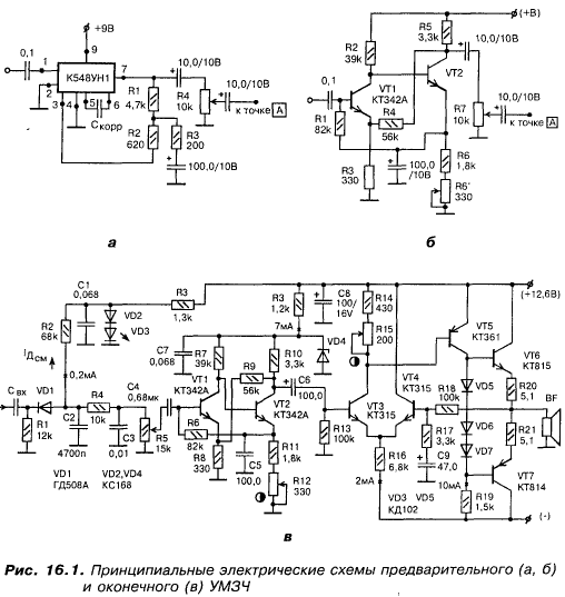 “А”: Я имел в виду построение,предварительных каскадов УМЗЧ. Вот они — выбирай (рис. 16.1, а, б).