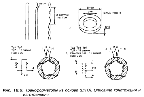 “А”: Посмотри внимательно на этот рис. 16.3. Я все изобразил на нем. Прежде всего, чтобы приступить к намотке ШПТЛ, необходимо подготовить СДВОЕННУЮ И СКРУЧЕННУЮ ПАРУ проводов. Мой совет - в данной конструкции применяем ПЭВ-2-0,22. Отрезав от катушки с проводом кусок длиной 1 метр, далее поступают так, как указано на рис. 16.3.