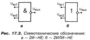 “А”: Точно так! Во всех схемах логики (или цифровых схемах малого уровня интеграции) приняты следующие обозначения. Прямоугольник с выводами, изображенный на рис. 17.3, а, читается как 2И —НЕ, а изображенный на рис. 17.3, б, как 2ИЛИ— Н Е. Означает это тот факт, что уровень логического “О” на выходе (рис. 17.3, я) будет в том случае, если на ОБОИХ входах будет присутствовать уровень логической “1”. Что касается элемента, изображенного на рис. 17.3, б то уровень логической “1” будет присутствовать на его выходе в случае, если ИЛИ на первом, ИЛИ на втором входах будет иметь место уровень логического “0. Понятно?