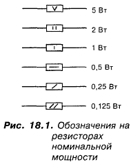 “А”: Вот здесь на рисунке я показал, каь обозначается номинальная мощность резисторов на схемах электрических принципиальных (рис. 18.1).