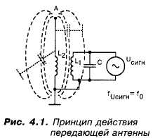 “А”: Верно! Однако в данном случае она не принимающая, а передающая. Попробуем представить себе, что при этом происходит... Видишь, на рис. 4.2 я изобразил только непосредственно антенну и то в очень упрощенном виде?