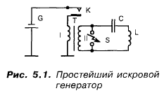 В 1887 г. выводы Максвелла были экспериментально подтверждены Генрихом Герцем. Он построил ИСКРОВОЙ ГЕНЕРАТОР электромагнитных волн и исследовал их свойства. Вот что представлял собой этот генератор (см. рис. 5.1). Его основа — уже известный нам колебательный контур. Но ... поскольку колебания в реальном контуре быстро затухают (а электронных ламп и транзисторов еще и в помине не было), то в качестве быстродействующего коммутатора, позволяющего заряжать конденсатор и переключать его от батареи к катушке, был использован ... искровой промежуток между двумя металлическими шариками!