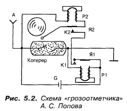 Не только наличие антенны являлось важнейшим элементом приемника Попова, но и релейный усилитель постоянного тока также! Поскольку относительно слабый ток через когерер приводил в действие чувствительное реле Р1, контакты которого замыкали цепь электрического звонка.