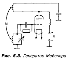 “С”: Да, искровая техника этим свойством не обладала! Там можно было говорить только о некотором спектре частот! Итак, генераторы Армстронга, а также Фореста и Александра Мейснера позволили получать чистые непрерывные синусоидальные сигналы! Вот схема лампового автогенератора на рис. 5.3.