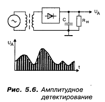 “С”: Разумно! Итак, на представленной схеме показан простейший детектор амплитудно-модулирован-ных сигналов, а рядышком представлена эпюра выходного напряжения UA. В качестве сопротивления нагрузки rh могут использоваться наушники (рис. 5.6).