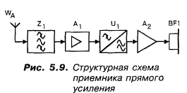 “С”: Да потому, что его там просто нет! Кстати, “в последнее время стало модным разливать чай через ситечко”! Я это к тому, что нам будет удобнее, наряду с блок-схемами, пользоваться также СТРУКТУРНЫМИ СХЕМАМИ! Тогда, с учетом пожеланий Незнайкина, я изображу структурную схему приемника прямого усиления на рис. 5.9.