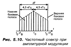 “С”: Взгляни на следующий эскиз (рис. 5.10)! Здесь я изобразил частотный спектр AM — сигнала ОДНОЙ радиостанции. Следовательно, даже отведя на одну станцию полосу частот 9 кГц, передать сигнал, в котором содержится ВЕСЬ воспринимаемый ухом звуковой спектр — НЕЛЬЗЯ! Самая верхняя звуковая частота, это — 4,5 кГц! Хотя должен сказать, что если не слишком придираться к качеству звука, этого вполне хватает даже для приема ритмов современной музыки.