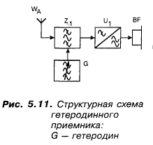 Мы уже упоминали ГЕТЕРОДИННЫЙ ПРИЕМНИК. Вот так он выглядит на структурной схеме (рис. 5.11). Стрелка означает, что его можно перестраивать по частоте.