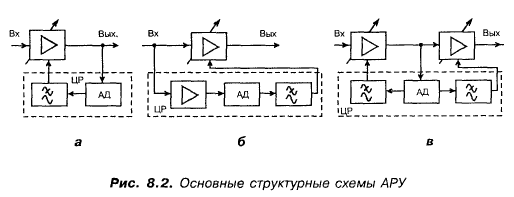 “С”: Различают три основные системы АРУ: с ОБРАТНЫМ (рис. 8.2, и), ПРЯМЫМ (рис. 8.2, б) и СМЕШАННЫМ (рис. 8.2, в) регулированием. При обратном регулировании управляющее напряжение определяется напряжением сигнала (его уровнем) на выходе. Это наиболее простая АРУ и весьма действенная. В системе с прямым регулированием управляющее напряжение определяется напряжением сигнала на входе.