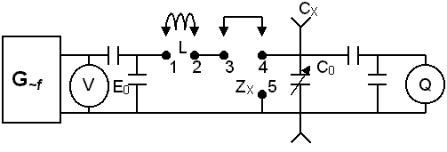 На частотах более 50кГц для измерения параметров двухполюсников применяют метод, в основе которого лежит явление резонанса. Схема такого метода представлена на рисунке.