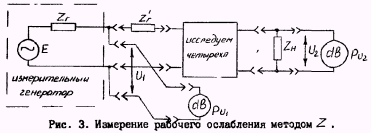 Из этих выражений следует, что процесс измерения рабочего ослабления и усиления при известных значениях Zн и Zr сводится к измерению размеров э д с генератора Е и напряжения U
